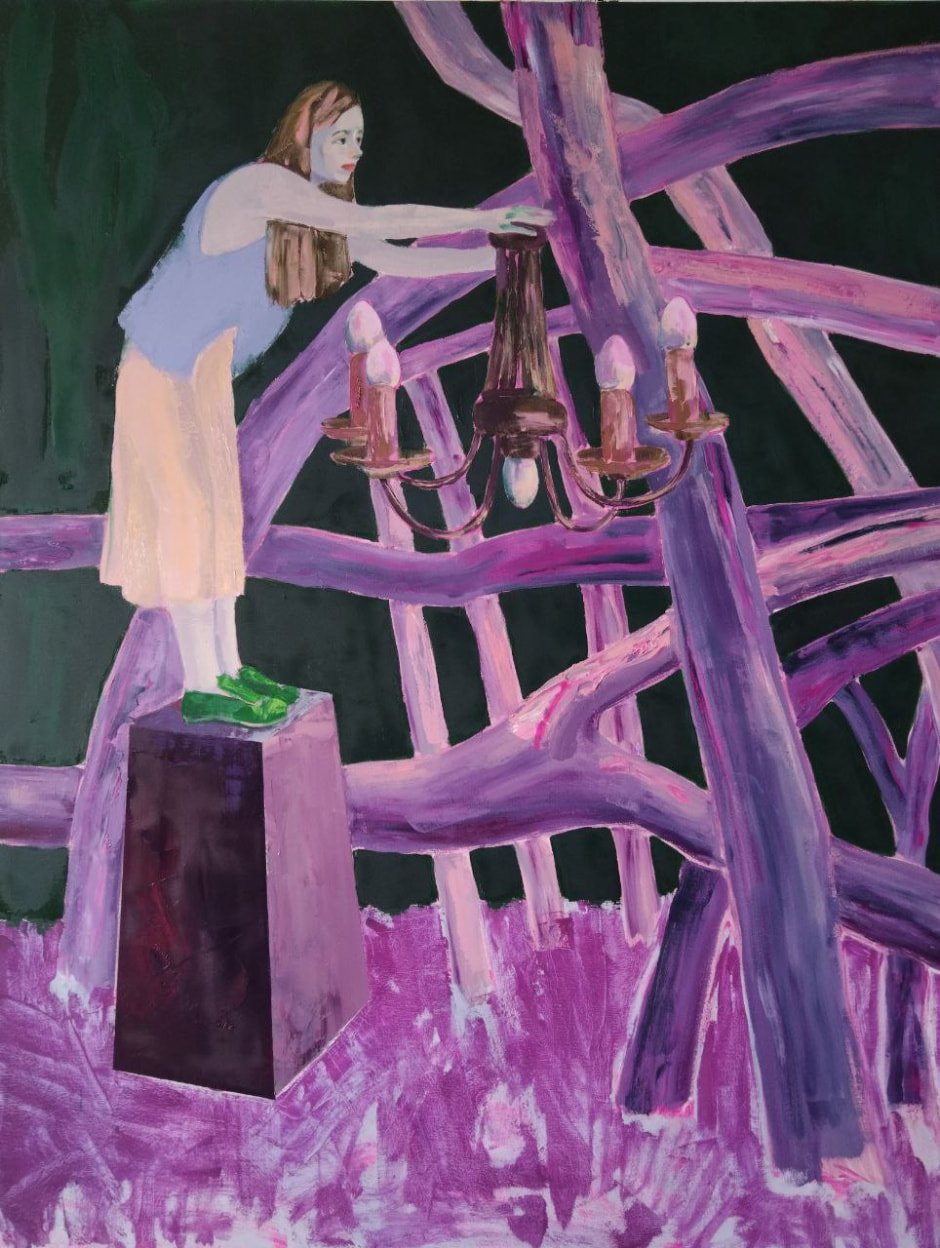 Катерина Пашкевич. Обустройство дома, холст, масло. 2025– Билет на поезд и дорога через лес. Четыре часа – кайф просто. Это для меня – про силу, про то, чем я могу напитаться. Ну и бабушка… Ей сейчас 95 лет. Я обожаю слушать ее истории. Это для меня – связь с корнями, – так Катерина вспоминает, как в детстве ездила из Бреста к бабушке в деревню в Минскую область.