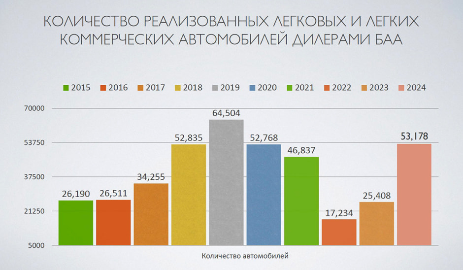 В 2024 году в объемах продаж значительно снизилась доля легкой коммерческой техники, при этом прирост в продажах легковых автомобилей составил 128%. Существенно возросла доля китайских автомобилей: из 100 моделей, которые официально продавались через дилерские сети членов БАА, 65 родом из Китая (включая Geely и Belgee).