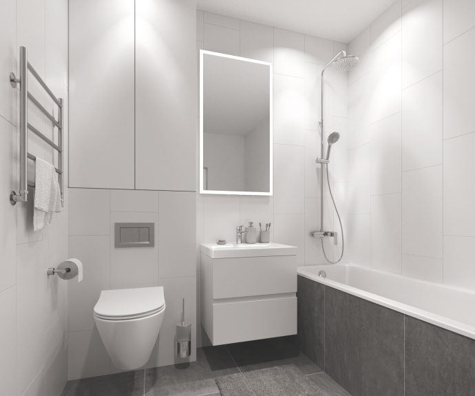 Облик ванной комнаты образуют сочетание белого и серого керамогранита. А еще – подвесной унитаз, полотенцесушитель, встроенный шкаф, тумба с умывальником и зеркало с подсветкой. Из неординарного – возможность выбрать между душевым уголком и ванной. В качестве дополнения можно заказать кухню Lagom Kitchen White.