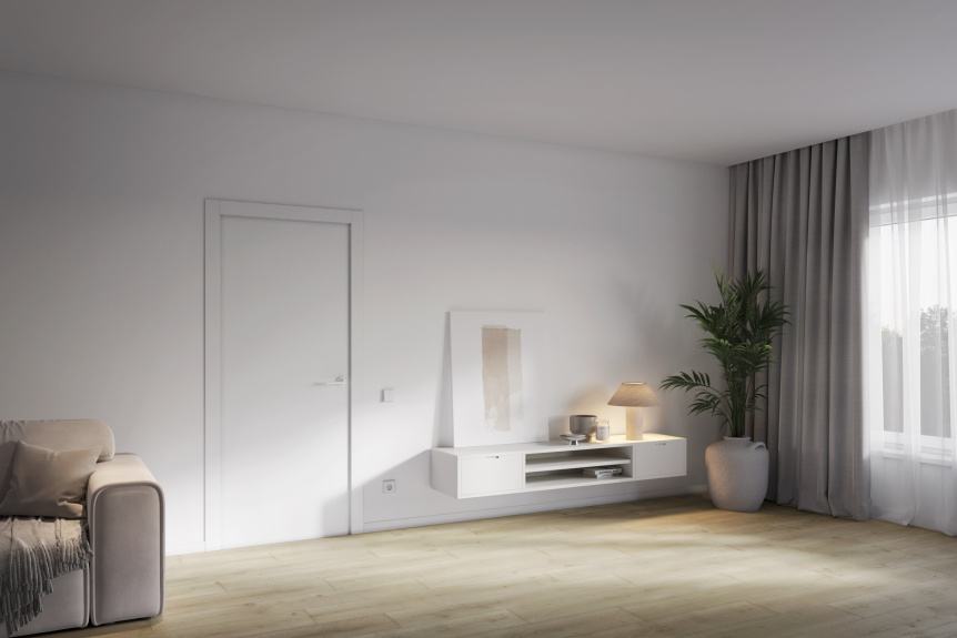 Lagom White состоит из окрашенных белых стен, бежевого ламината с фаской и подвесного потолка из гипсокартона. Для создания визуального эффекта высоких потолков, плинтус подобран под оттенок стены, а лаконичные межкомнатные двери выполнены в белом цвете со скрытыми петлями.