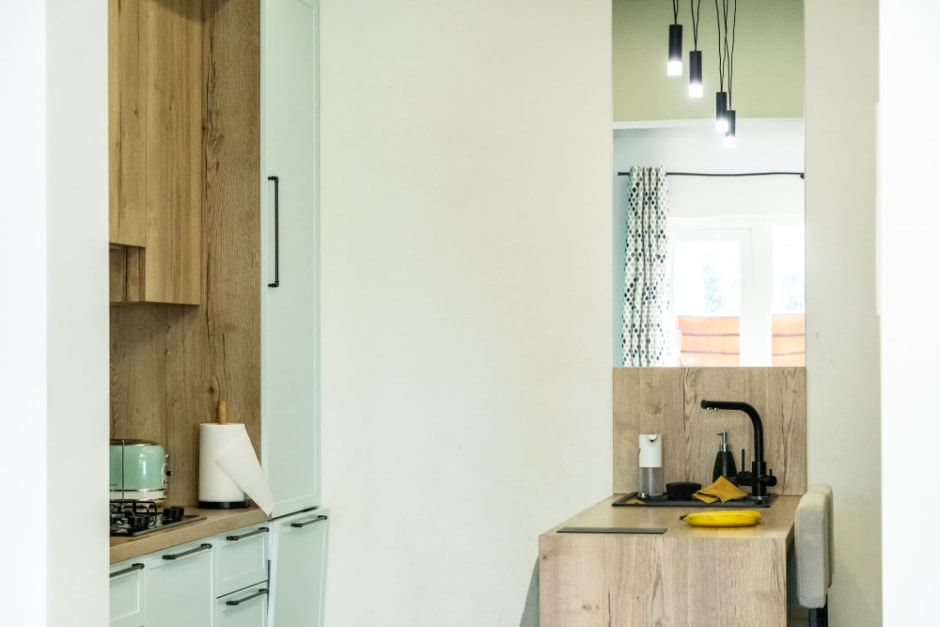 – Это ДСП от бренда Egger, в одной и той же текстуре – “дуб галифакс”, но в разных оттенках. Я слышала, что он выходит из моды – камон, ребята, это же классика! И, честно, говоря, я больше люблю качественную ДСП, чем натуральное дерево. Оно коробится, рассыхается, скрипит, а с ДСП нет никаких проблем.