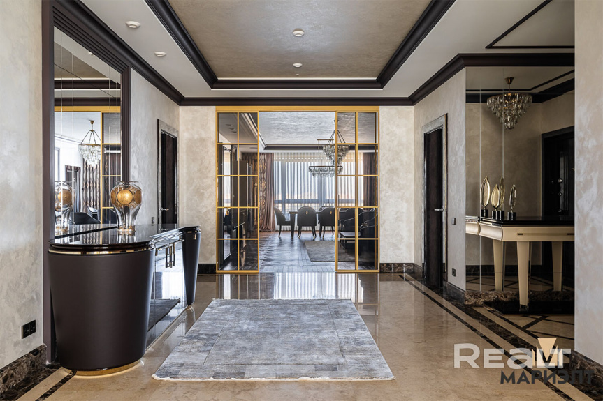 В объявлении говорится, что дизайн "отличается сложностью исполнения архитектурных и декоративных решений, сочетанием эксклюзивных материалов отделки и уникальных предметов интерьера".