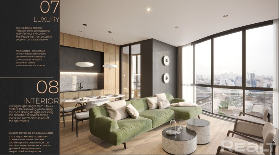 Будущим владельцам этого элитного жилья обещают "полностью готовое для жизни атмосферное пространство", которое "позволяет легко абстрагироваться от внешнего мира и наполниться энергией на весь день". Помогут в этом система "умный дом", собственные бассейн, баня с сауной и терраса.