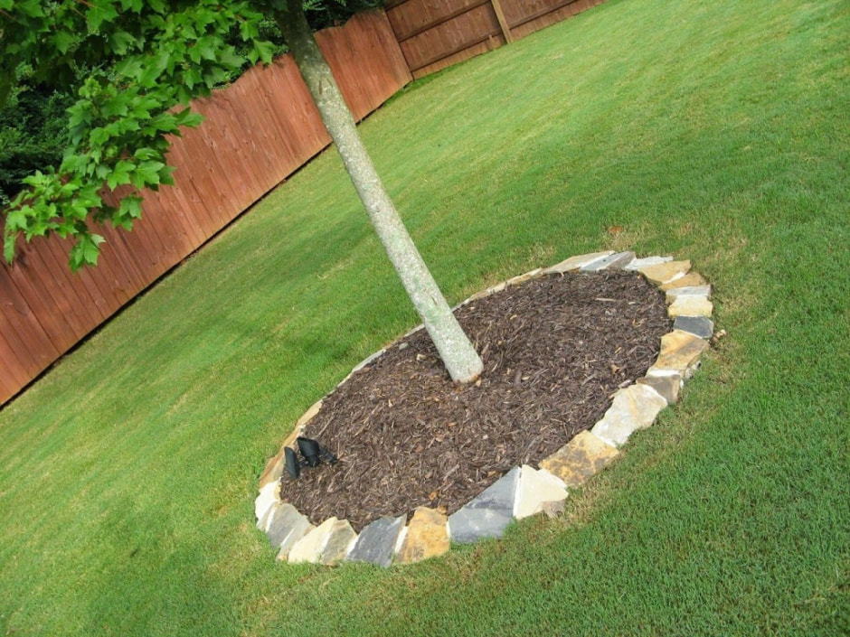 Размечаем равномерный круг, убираем дерн аккуратно, чтобы не повредить корни, либо мульчируем сверху.