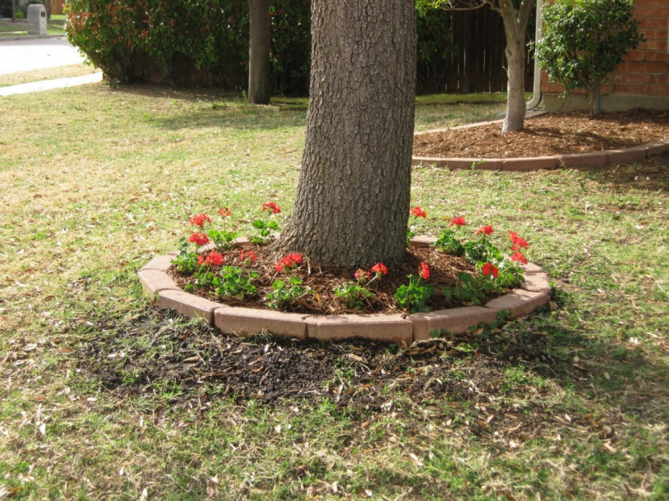Цветник — яркий вариант: плауны, тюльпаны, хосты и пр. Важно: декоративные растения не должны конкурировать с деревом — семена используйте осторожно.
