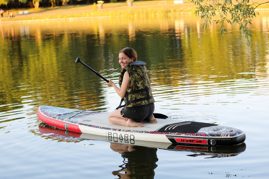 Как сесть и не упасть? Легко. Инструктор поможет перейти на доску. Сперва нужно сесть на сапборд, чтобы почувствовать доску и привыкнуть к ней – это займет минут 5-10. Затем можно привстать на колени, а после того, как почувствуете себя уверенно, можно попробовать аккуратно подняться на ноги.