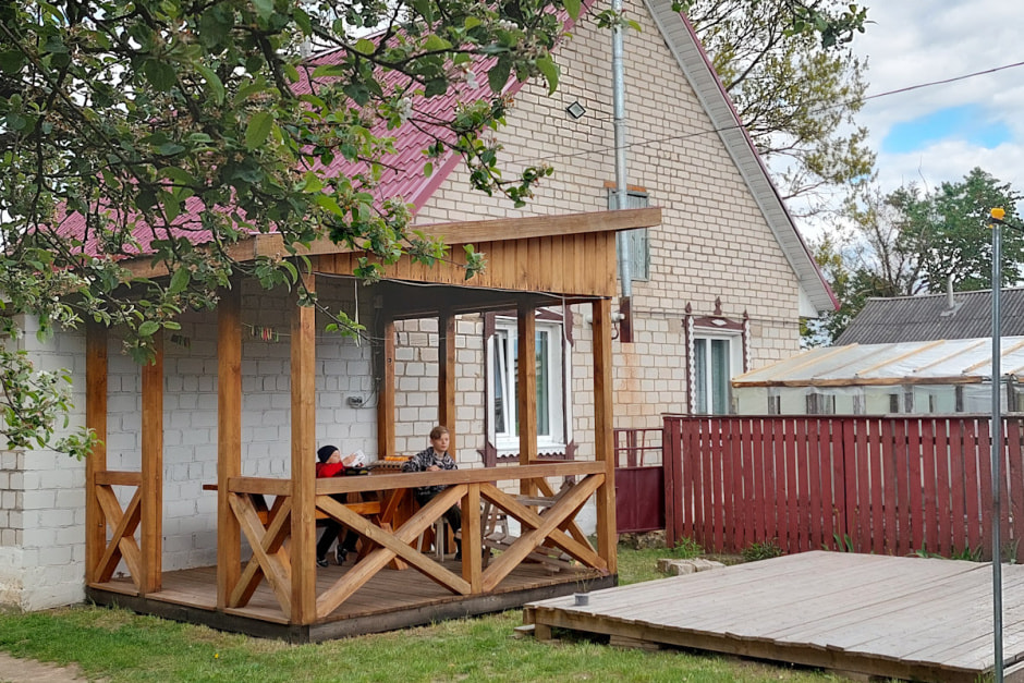 Дачный сезон семья Галины Вяжевич открыла в большие майские выходные: покосили газон, затопили баньку, поставили на улицу батут. То, что в этом доме весело, можно понять, даже не заходя во двор: играет громкая музыка, слышен детский смех и звук мяча. Ничего себе: дети не сидят дома с телефоном, а бегают по двору.
