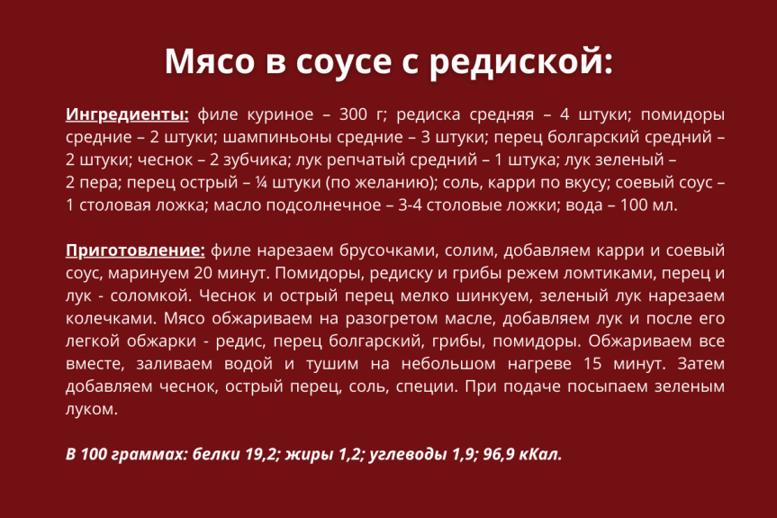– Редиску готовят даже на гриле, – продолжила удивлять Ирина Савина. – Есть рецепты плова, где она заменяет морковь. В нашем варианте используются оба овоща.