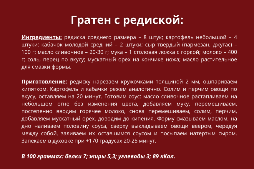 У Ирины Савиной в копилке нашлись и другие необычные рецепты с редисом. Это и гратен, и паровой овощной гарнир, и окрошка.