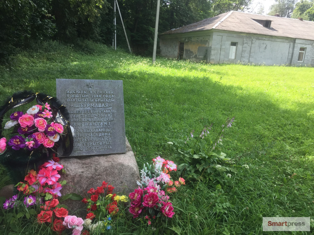 После революции 1917 г. усадьба Хмаров разорена, затем здесь разместился детский интернат. А в годы войны он превратился в детский концлагерь: немцы проводили медицинские эксперименты над детьми. 224 ребенка из 500 погибли. Остальные в феврале 1944 г. были вывезены партизанам бригады "Штурмовая" в Логойский район. Об этом рассказывает памятная плита.