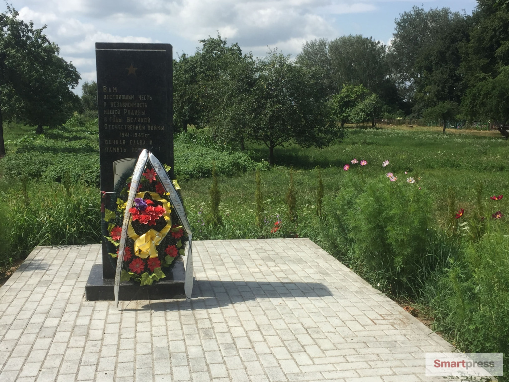 Рядом с церковью - памятник жертвам Великой Отечественной. Искусственный венок лежит: к мемориалу, видно, приходят.