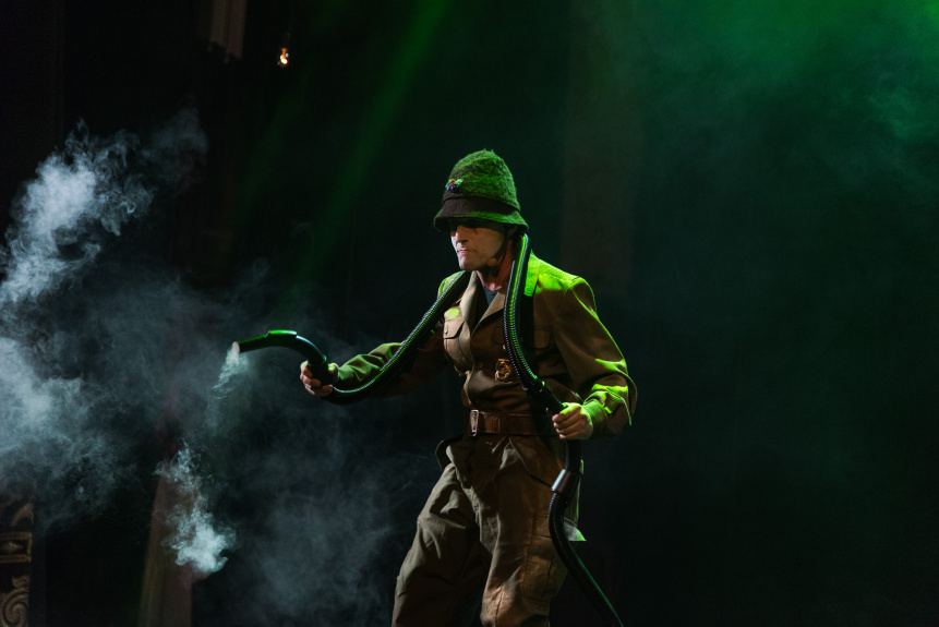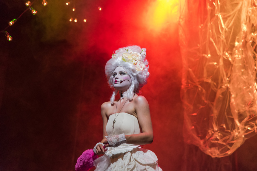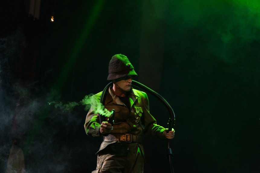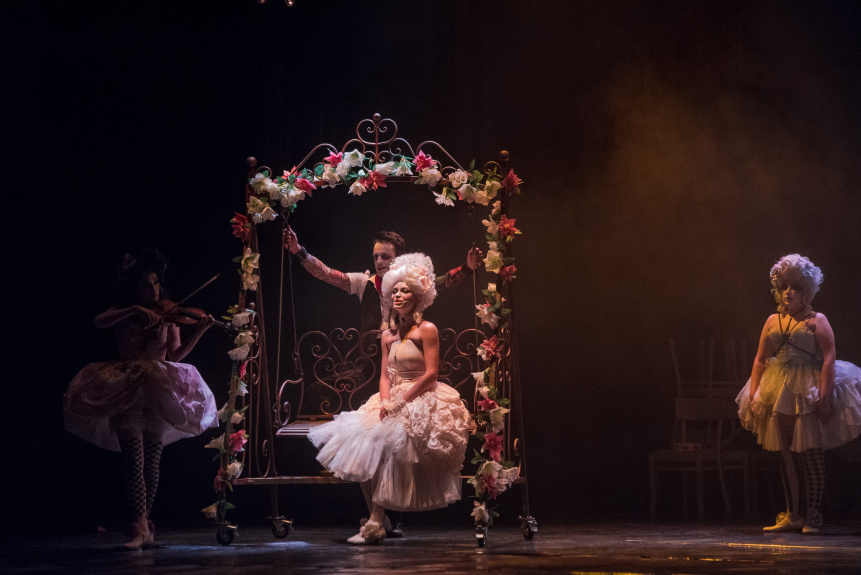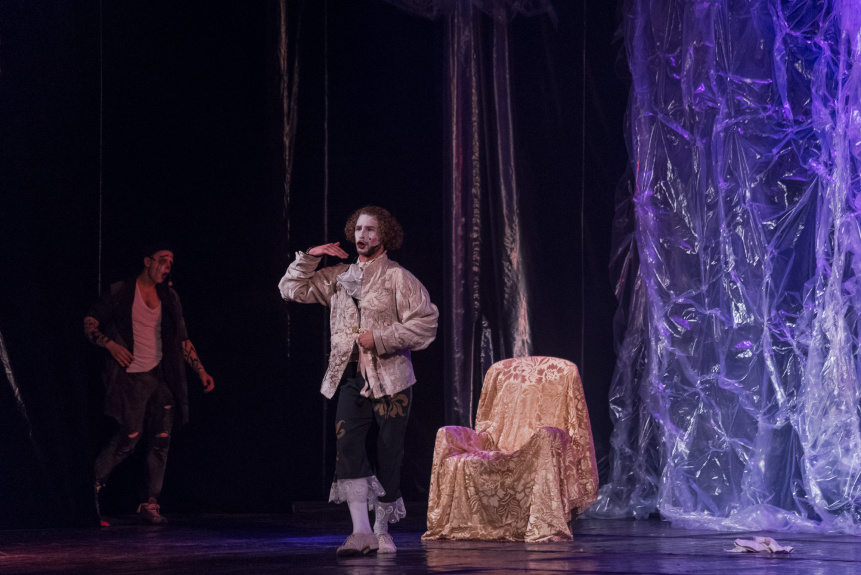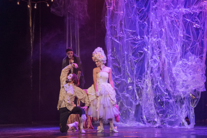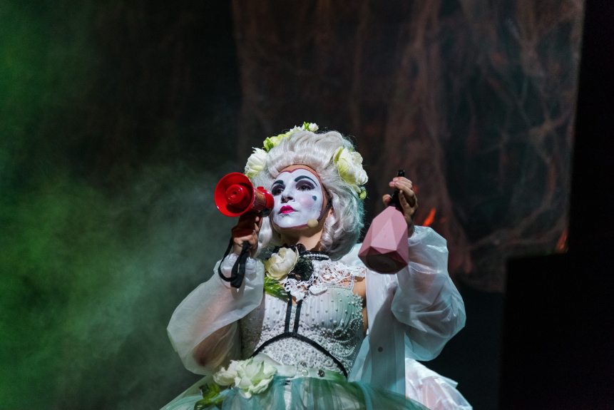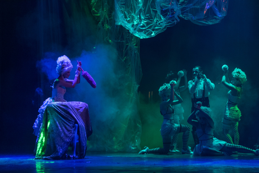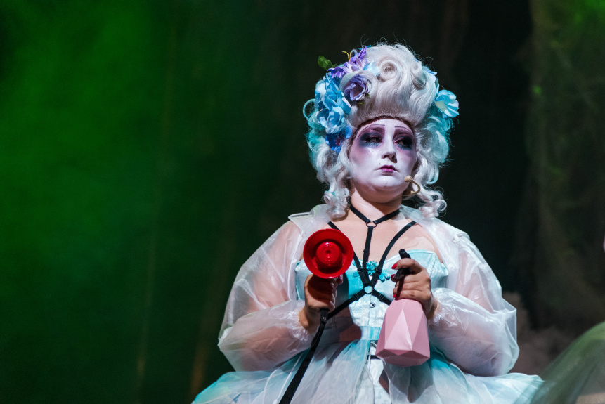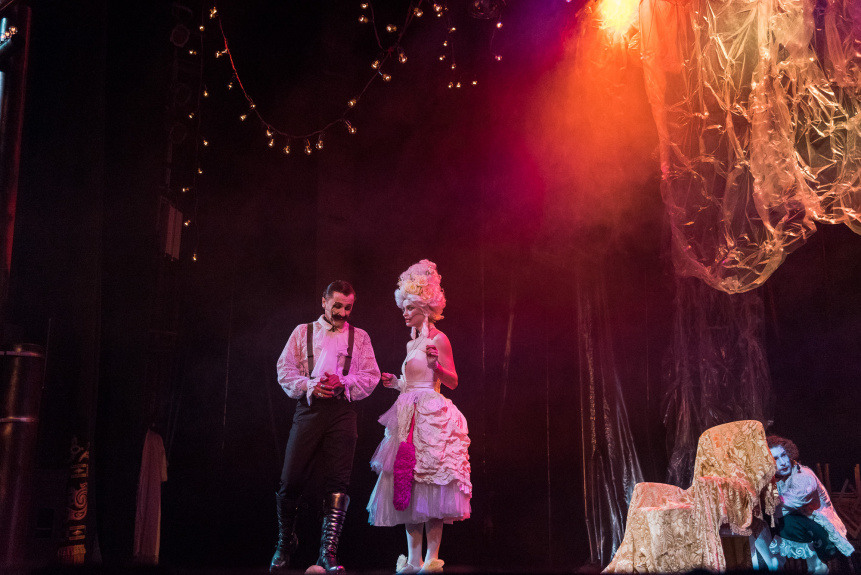 История в спектакле тоже начинается с банальности: уставший от трех лет супружества ловелас хочет заполучить себе в любовницу невесту своего слуги, будущие молодожены с таким раскладом не согласны, поэтому задумывают цепочку переодеваний и подмен, чтобы не только выйти самим сухими из воды, но и вернуть хозяина в объятия любящей его супруги. Однако все эти любовные хитросплетения Анастасия Гриненко разворачивает на фоне экологического апокалипсиса. Сценограф Андрей Меренков выстраивает перед зрителями заброшенный парк аттракционов, который периодически затягивается целлофаном, будто превращается время от времени в научную лабораторию или испытательный полигон. Среди героев в костюмах и париках эпохи рококо (художник по костюмам Юлия Бабаева) постоянно появляются странные персонажи в костюмах химзащиты, читающие лекции про вред смога и опасность кислотных дождей, готовые в любой момент провести срочную дезинфекцию.