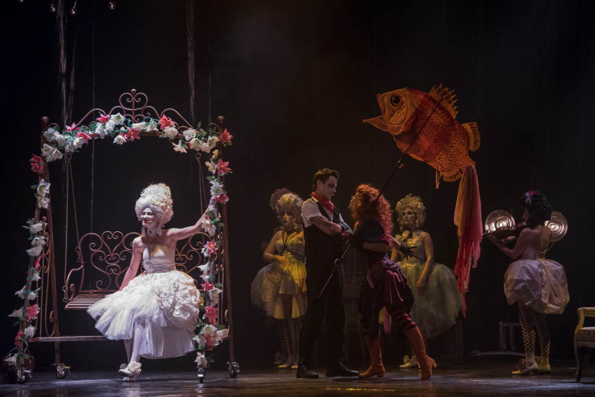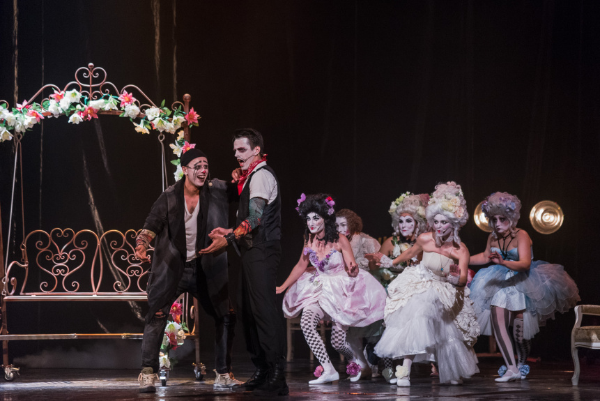 В долгожданной и самим театром премьере задействован весь состав "Территории мюзикла". Им достался благодатный материал: музыкальную драматургию Анастасия Гриненко строила на классической музыке Моцарта и Россини, ариях из таких признанных бродвейских мюзиклов, как "Девять", "Дрянные девчонки", "Варьете", "Наташа, Пьер и комета 1812 года" и русском роке. Кто бы мог подумать, что глэм-рок "Агаты Кристи" так ляжет на образ любвеобильного графа Альмавивы (актер Дмитрий Якубович), "Би-2" своим "Фламенко" изящно подчеркнут противостояние графа и Фигаро (актер Артем Пинчук), а ироничный нуар "Крематория" даст толчок для линии, завязанной на пост-апокалипсисе.