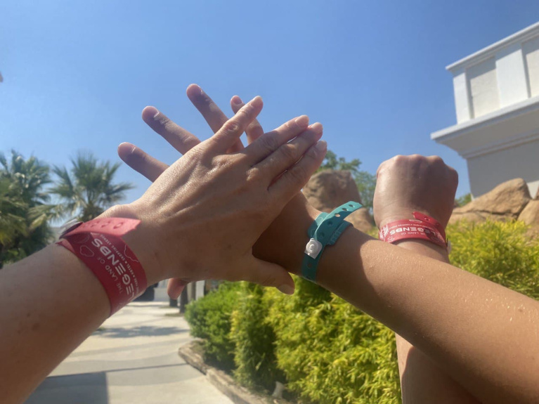 После оплаты билета вы получаете браслет: красный взрослые, синий дети и зелёный - за проход без очереди. Браслет нельзя терять, так как в нем находится микрочип, которым вы открываете дверь шкафчика, оплачиваете еду и напитки на территории парка.