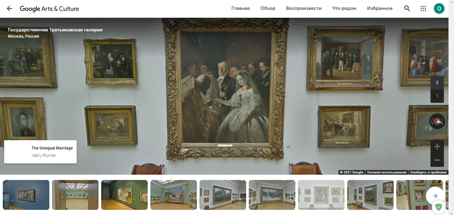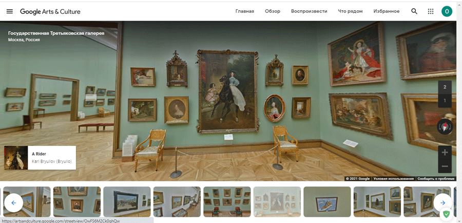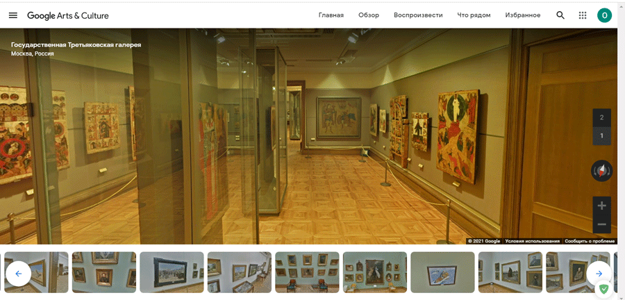 Из культурной столицы России – в официальную. А значит, в Третьяковку. В историческом здании галереи в Лаврушинском переулке размещается экспозиция русского искусства XII – начала ХХ века, занимает она 62 зала на двух этажах. Погулять по ним можно с помощью проекта Google Arts & Culture - интернет-платформы, предоставляющая доступ к изображениям произведений искусства с высоким разрешением. Навигация простая, но не сказать, что очень удобная.