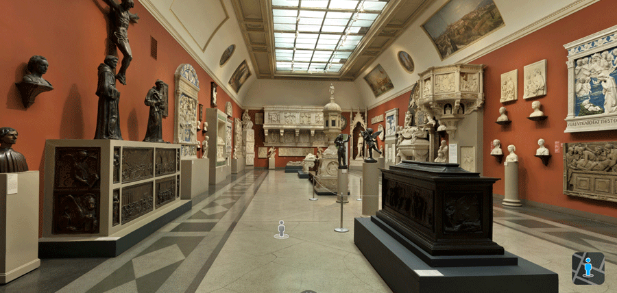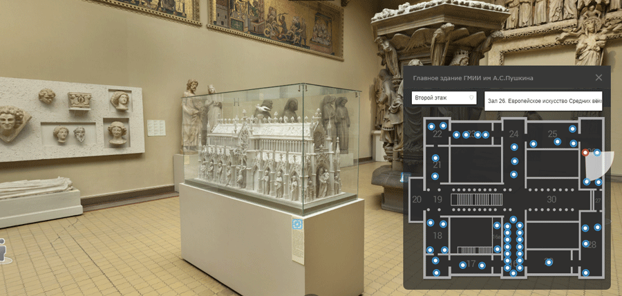 С помощью прилагающейся к каждому комплексу карты можно выбрать разные этажи и залы, а там уже - взглянуть на произведения искусства с разных ракурсов, в приближении или отдалившись. При необходимости можно перейти к полноэкранному режиму.