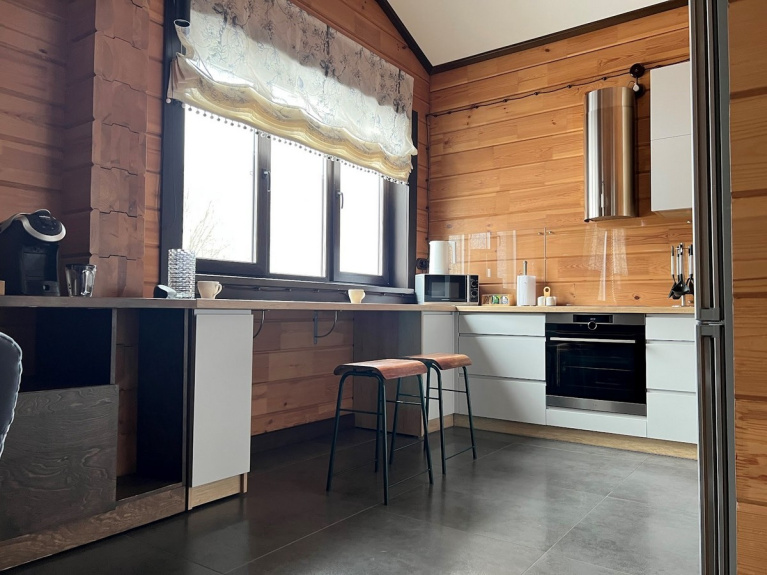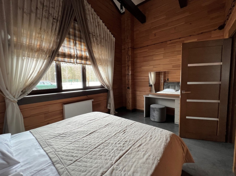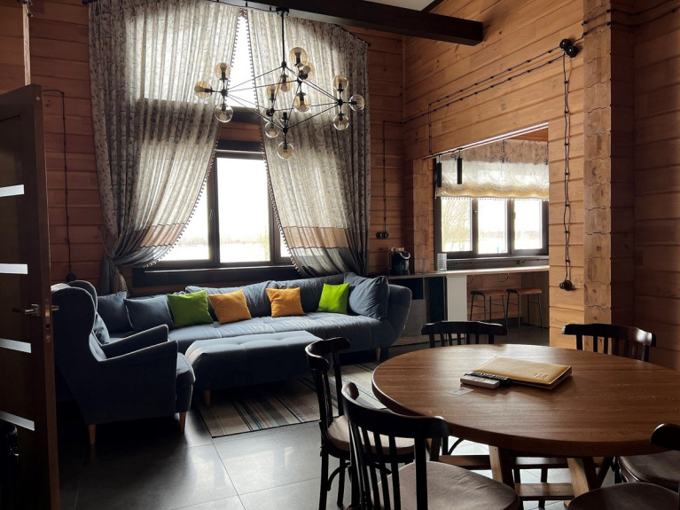 Вариант отдыха, с которым удалось познакомиться нам лично - шале Forrest. Это огромный дом из бруса, пахнущий свежесрубленной древесиной, со стильной мебелью, 7-метровыми потолками, дизайнерскими лампами и теплыми полами.