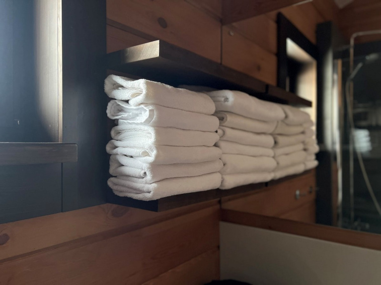 В экопарке три бани и СПА-комплекс. Например, эта баня с выходом прямо в озеро. Но если погода не располагает к купанию (как сейчас), есть огромная купель с теплой водой, в которой распарен дубовый веник.