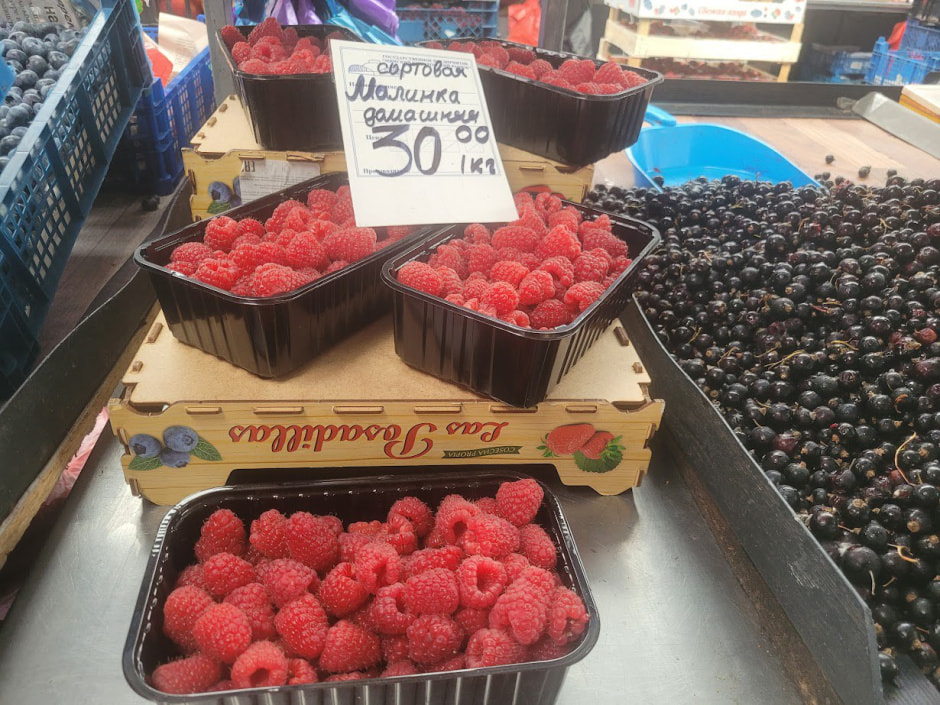 Пока хватает на рынке и клубники (12-15 рублей за 1 кг), есть черная смородина и поречка (обе ягоды по той же цене), а также крыжовник (20 рублей за 1 кг). Как и неделей ранее, преимущественно в лотках продается малина. Цены на эту ягоду – около 30 рублей за 1 кг.
