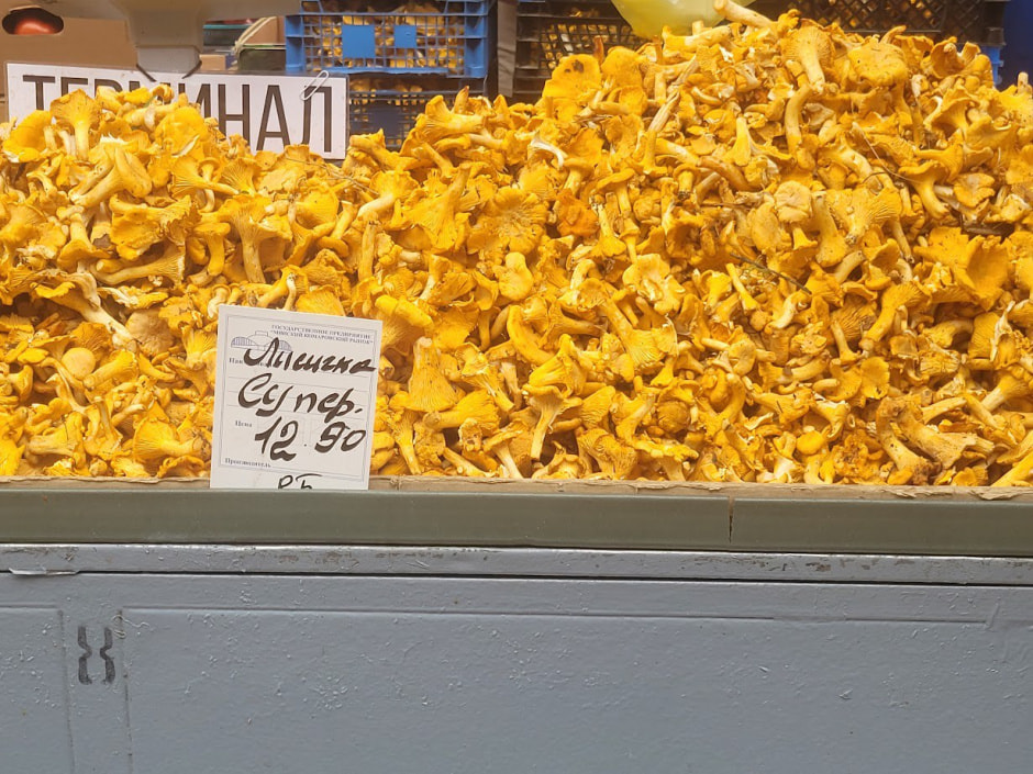 Грибы также можно купить без проблем. Немало предлагается лисичек и все по одной цене – 12-13 рублей за 1 кг.