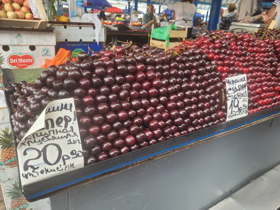 Черешня продается крупная и красивая, но ее уже немного по количеству на рынке. И наряду с ценами в 17 рублей за 1 кг можно найти ягоду и по 12 рублей за 1 кг (перезревшую, но тоже неплохую) и по 50 рублей за 1 кг (оценить ее достоинства нам оказалось сложно, но наверняка они есть).