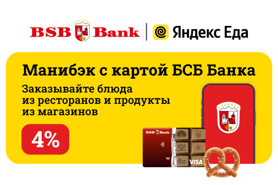 Получать манибэк 4% в Яндекс.Еда можно с 14 мая по 14 июня. Для этого нужно будет расплачиваться карточкой БСБ Банка каждый раз при заказе в этом сервисе доставки. Карту можно оформить на сайте Банка, приложении или в Mini App в Telegram.