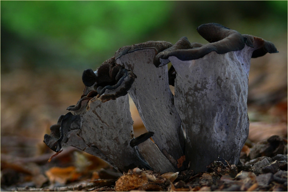 Чёрная лисичка, или вороночник рожковидный (Craterellus cornucopioides) во вкусе не уступает своим жёлтым собратьям. Однако теперь гриб под защитой: его тонкая, тёмная, воронковидная шляпка также исчезает с лесных троп.
