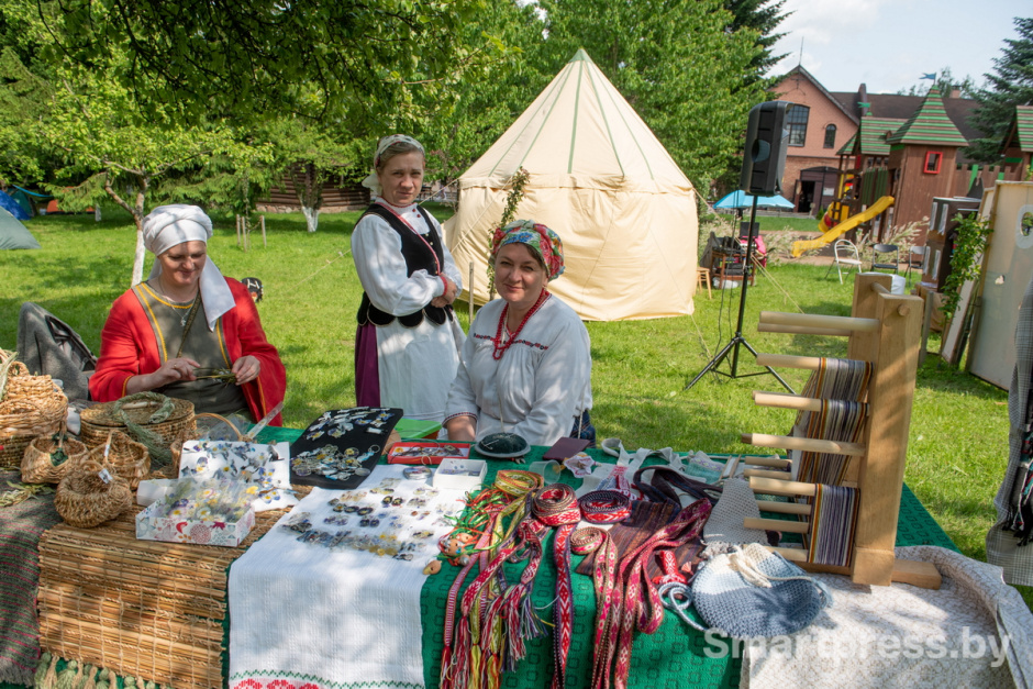 Однако наши предки плели не только из ниток, но и из трав. Причем, венками не ограничивались. На “Свята Сонца” приехала команда рукодельниц из Лидского отдела ремёсел. Мы завороженно наблюдаем за их работой.