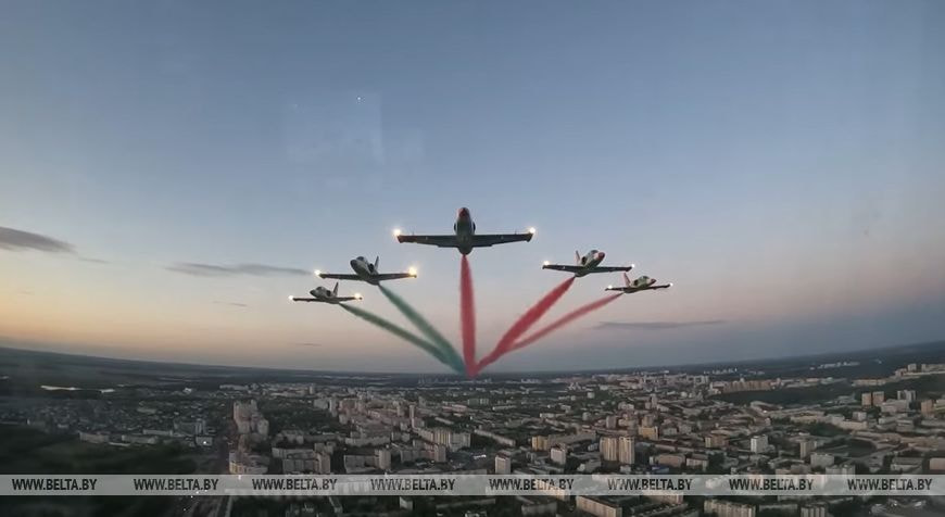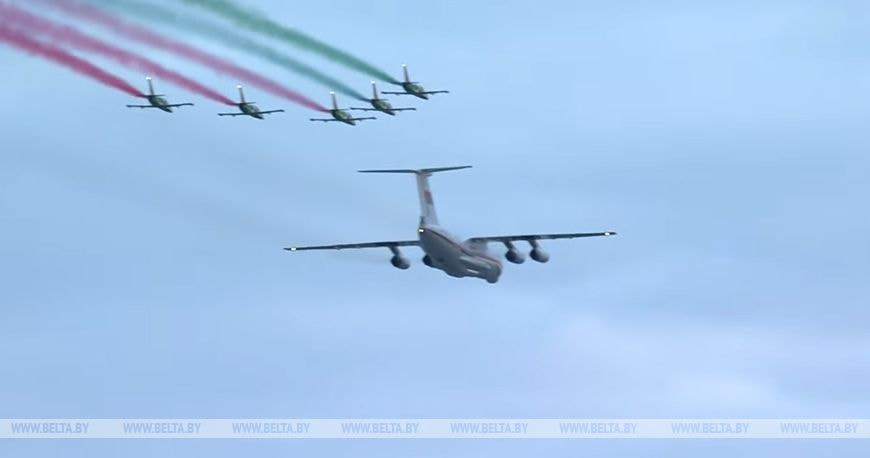 В воздушной части парада участвовали боевые вертолеты и самолеты Военно-воздушных сил и войск противовоздушной обороны Беларуси и Воздушно-космических сил России в составе восьми групп, сообщает агентство.